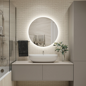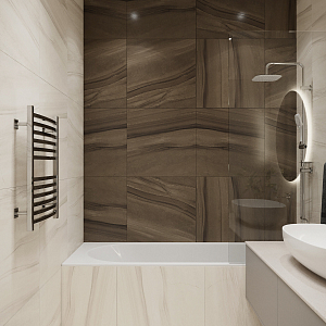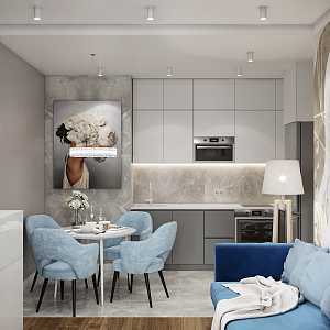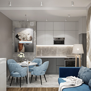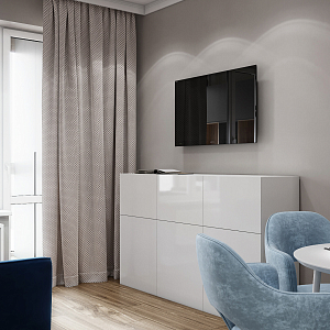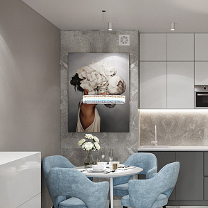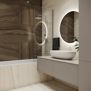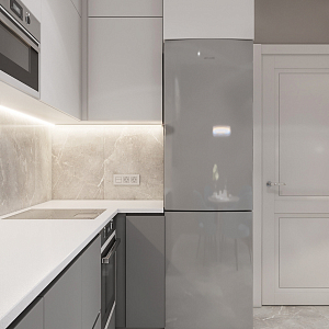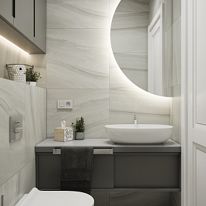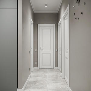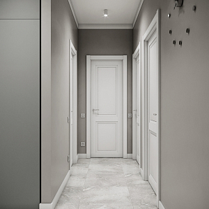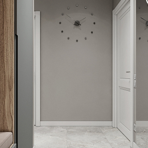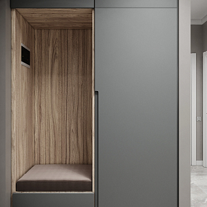 Интерьер прихожей с нишей с подсветкой, зеркалом на двери, рейками с подсветкой, подсветкой настенной, подсветкой светодиодной, подсветкой рабочей зоны и с подсветкой в современном стиле, проект «ЖК Гринада» №14