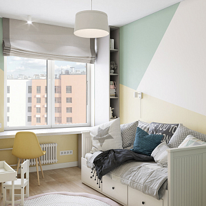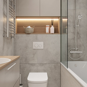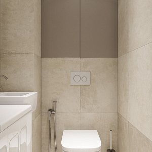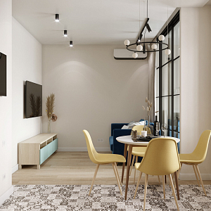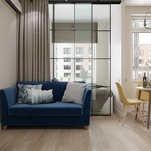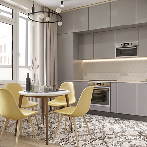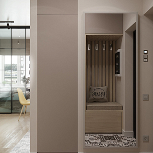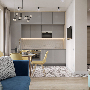 Интерьер гостиной с панно за телевизором, стеной с телевизором, телевизором на рейках, телевизором на стене и керамогранитом на стену с телевизором в современном стиле, проект «Ильинские луга» №29