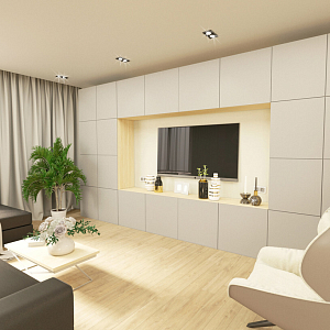 Интерьер спальни с керамогранитом на стену с телевизором, нишей для телевизора, панно за телевизором, полками над телевизором, стеной с телевизором, телевизором на рейках и телевизором на стене в современном стиле, проект «Проект в современном стиле» №16