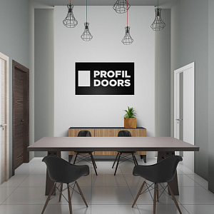 Интерьер коридора с проходной, зеркалом на двери и порогом в современном стиле, проект «Фирменный магазин PROFIL DORS» №8