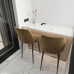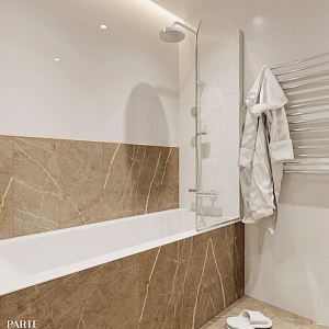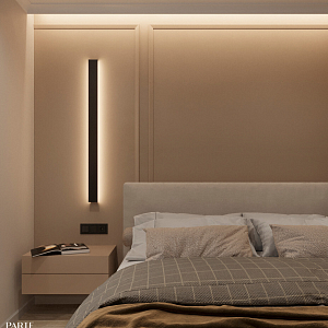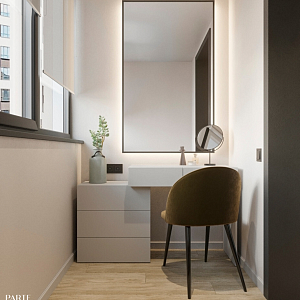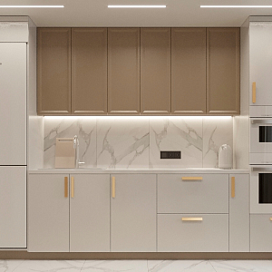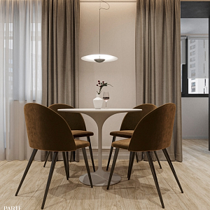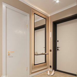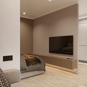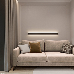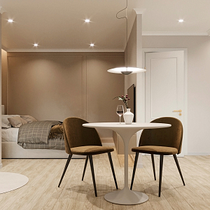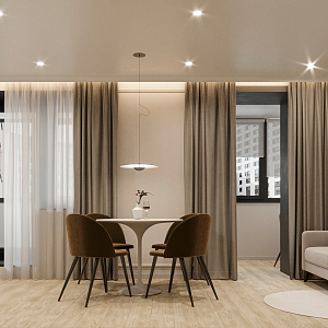Интерьер с open space, без дверей, без окна, гостиной-столовой, зонированием, нишей, переговорной, перегородкой, подсветкой светодиодной, порогом, проемом, проходной, с подсветкой и световыми линиями в современном стиле, проект «ЖК Серебряные ключи» №3