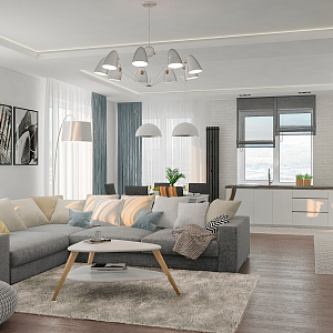 Интерьер гостиной с подсветкой светодиодной, рейками с подсветкой и световыми линиями в скандинавском стиле, проект «Проект гостиной частного дома. Подсосенки.» №3