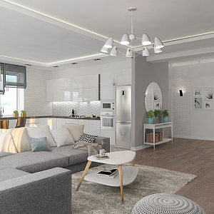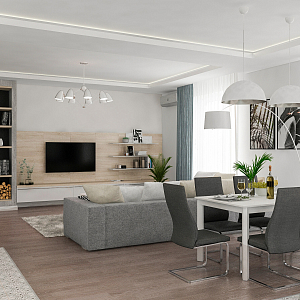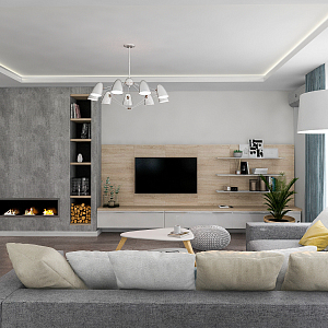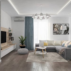Интерьер гостиной с подсветкой светодиодной, рейками с подсветкой, с подсветкой и световыми линиями в скандинавском стиле, проект «Проект гостиной частного дома. Подсосенки.» №8