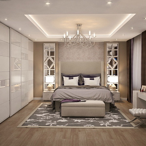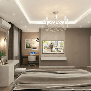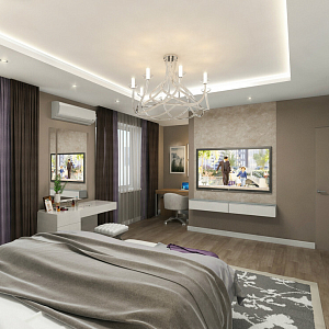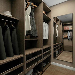 Интерьер гардеробной с в деревянном доме, гардеробной, гардеробной зой кроватью, гардеробной со шторой, кладовкой, кроватью над гардеробной и шкафом у кровати в современном стиле, проект «Дизайн проект квартиры. 114 кв.м.» №16