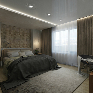 Интерьер спальни c рабочим местом, световыми линиями, рейками с подсветкой, подсветкой настенной, подсветкой светодиодной и с подсветкой, проект «Спальня для молодой пары. Саратов» №2