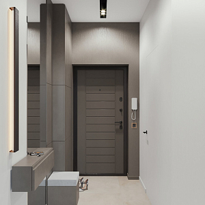 Интерьер прихожей cветовыми линиями, рейками с подсветкой, порогом, подсветкой настенной, подсветкой светодиодной, подсветкой рабочей зоны и с подсветкой в современном стиле, проект «Квартира в современном стиле в ЖК "Московский квартал", г. Екатеринбург» №5