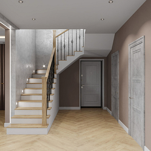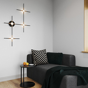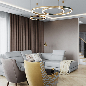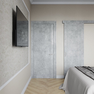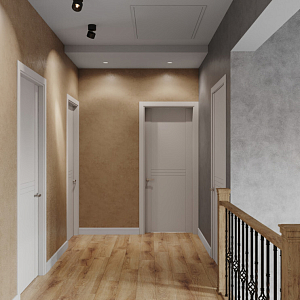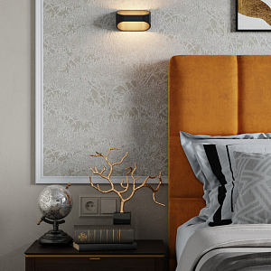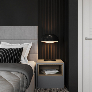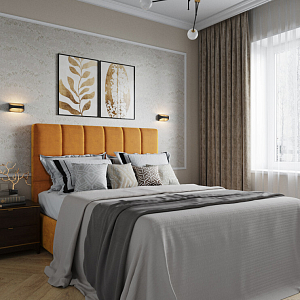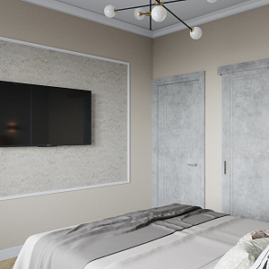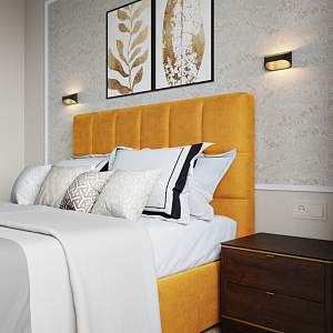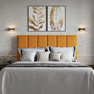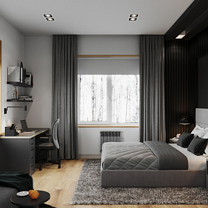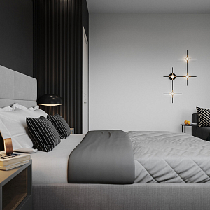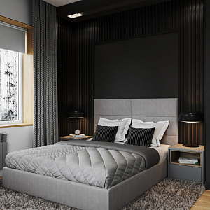 Интерьер спальни с подсветкой настенной, подсветкой светодиодной, рейками с подсветкой, с подсветкой, светильниками над кроватью и световыми линиями в современном стиле, проект «Загородный дом 200кв.м. В.Дуброво» №16