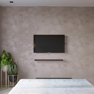 Интерьер гостиной с керамогранитом на стену с телевизором, нишей для телевизора, панно за телевизором, полками над телевизором, стеной с телевизором, телевизором на рейках и телевизором на стене в современном стиле, проект «ЖК Сочи перепланировка 3х комна №17