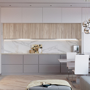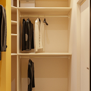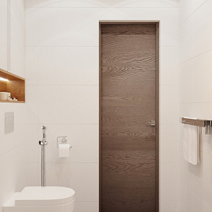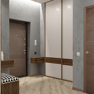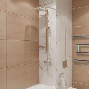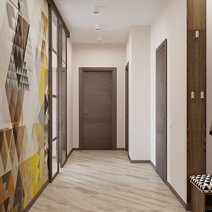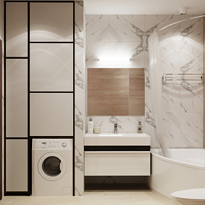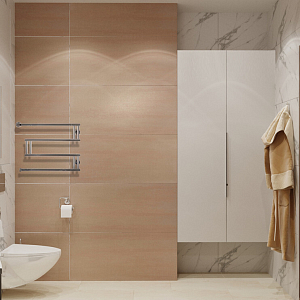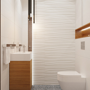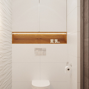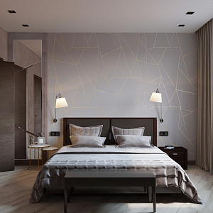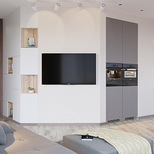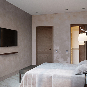 Интерьер спальни с панно за телевизором, стеной с телевизором, телевизором на рейках, телевизором на стене, нишей для телевизора, керамогранитом на стену с телевизором и подсветкой настенной в современном стиле, проект «ЖК Сочи перепланировка 3х комнатной №21
