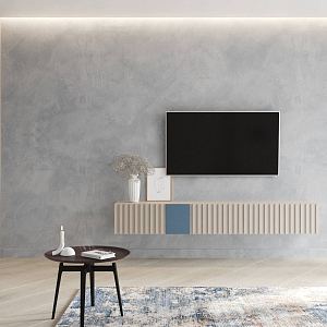 Интерьер гостиной с вертикальными жалюзи, зонированием рейками, подсветкой настенной, порогом, рейками с подсветкой, световыми линиями и телевизором на рейках в современном стиле, проект «ЖК Нагорный» №14
