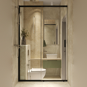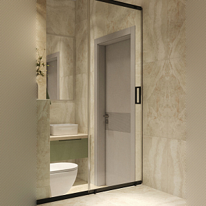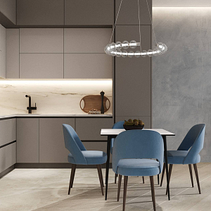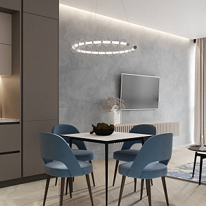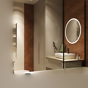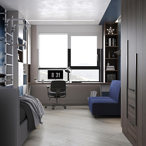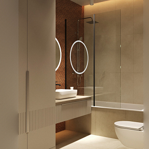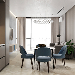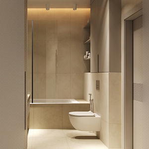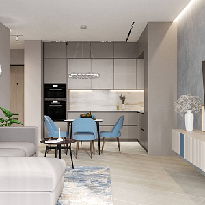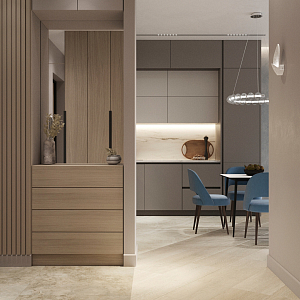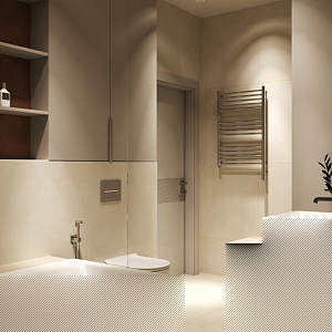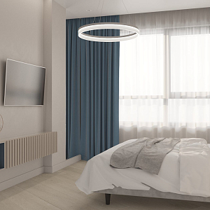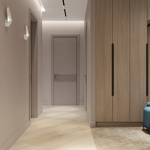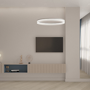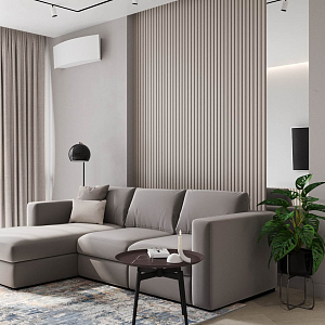 Интерьер гостиной с панно за телевизором, стеной с телевизором, телевизором на рейках, телевизором на стене и керамогранитом на стену с телевизором в современном стиле, проект «ЖК Нагорный» №16