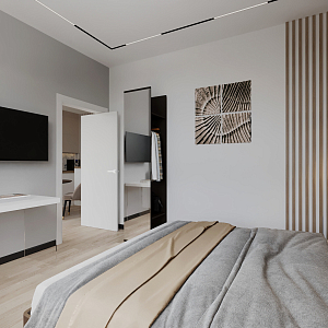 Интерьер спальни с бра над кроватью, светильниками над кроватью и шкафом над кроватью в восточном стиле, в стиле лофт и в современном стиле, проект «ЖК Макаровский» №18