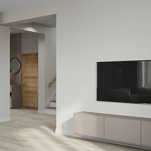 Интерьер гостиной с панно за телевизором, стеной с телевизором, телевизором на рейках, телевизором на стене, нишей для телевизора и керамогранитом на стену с телевизором в современном стиле, проект «Загородный дом 160кв.м.» №18
