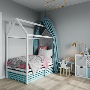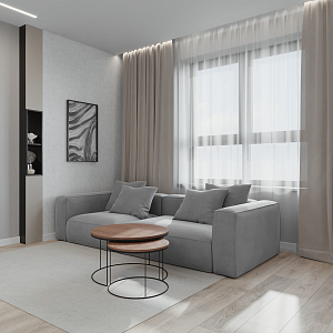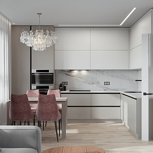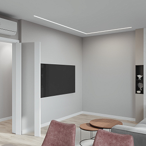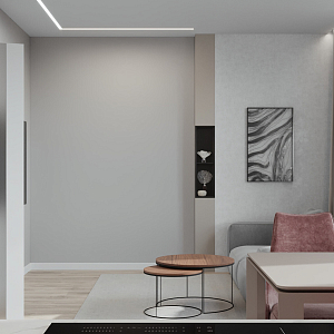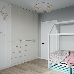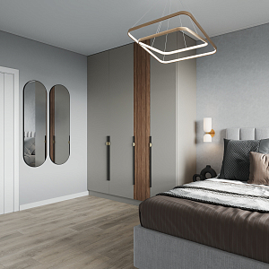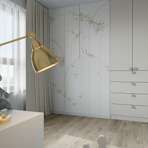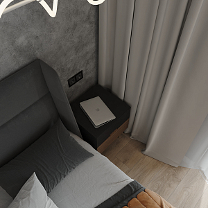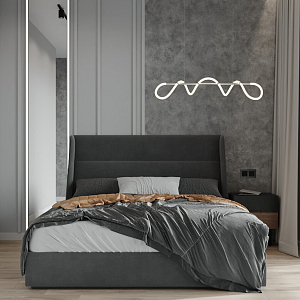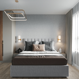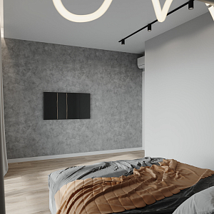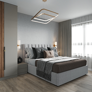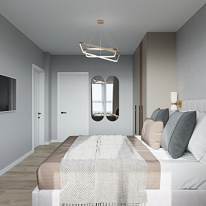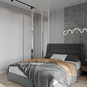 Интерьер спальни с подсветкой настенной, подсветкой светодиодной, рейками с подсветкой, с подсветкой, светильниками над кроватью и световыми линиями в современном стиле, проект «Легкость бытия ЖК Изумрудный бор» №1