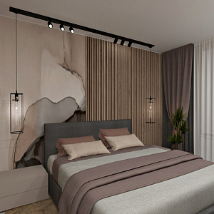 Интерьер спальни cветовыми линиями, рейками с подсветкой, подсветкой настенной, подсветкой светодиодной и с подсветкой в стиле лофт, проект «Квартира с элементами лофт» №1