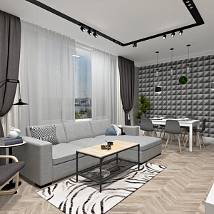 Интерьер гостиной cтеной с телевизором, телевизором на рейках, керамогранитом на стену с телевизором, рейками с подсветкой и подсветкой настенной в стиле лофт, проект «Квартира Лофт» №2