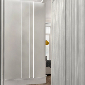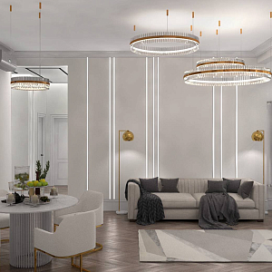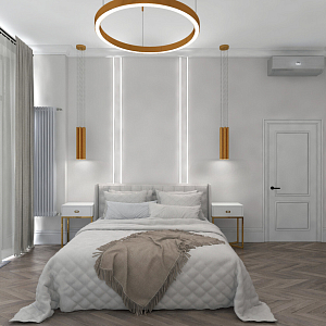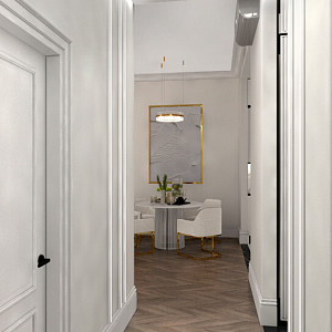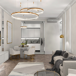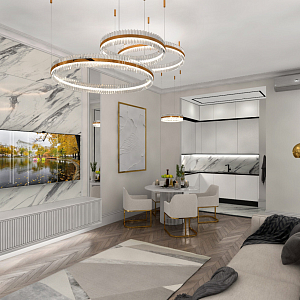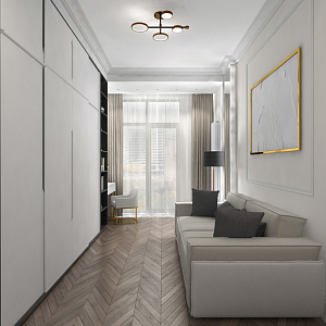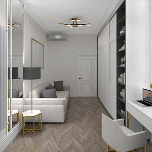 Интерьер с керамогранитом на стену с телевизором, панно за телевизором, подсветкой настенной, подсветкой светодиодной, рейками с подсветкой, с подсветкой, с рабочим местом, световыми линиями и стеной с телевизором в неоклассике, проект «ЖК West Garden» №13