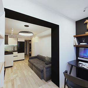 Интерьер гостиной cветовыми линиями, рейками с подсветкой, подсветкой настенной, подсветкой светодиодной и с подсветкой в современном стиле, проект «Мини-студия» №3