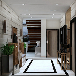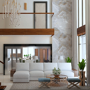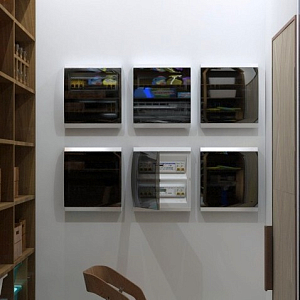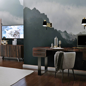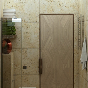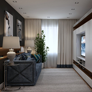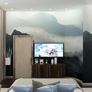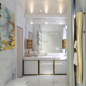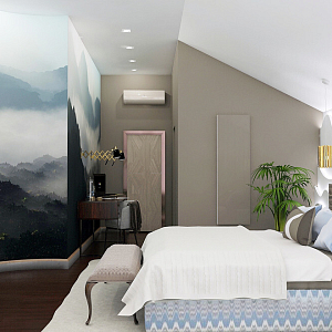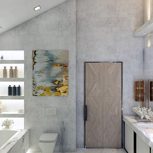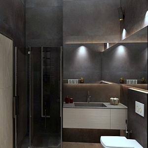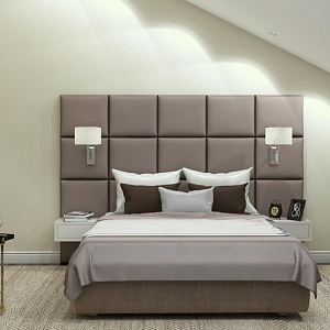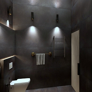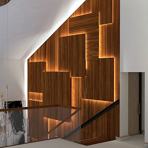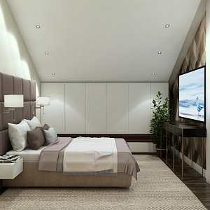 Интерьер спальни с бра над кроватью, нишей с подсветкой, подсветкой настенной, подсветкой светодиодной, рейками с подсветкой, с подсветкой, светильниками над кроватью и световыми линиями в современном стиле, проект «Абрау Дюрсо-Дом с видом на озеро» №27