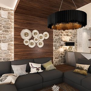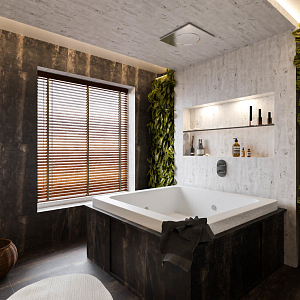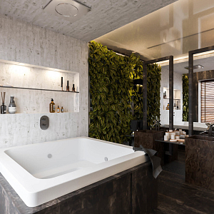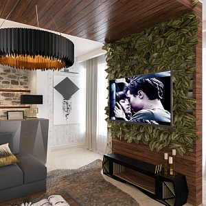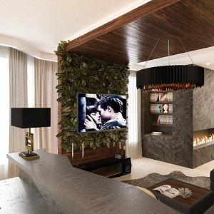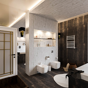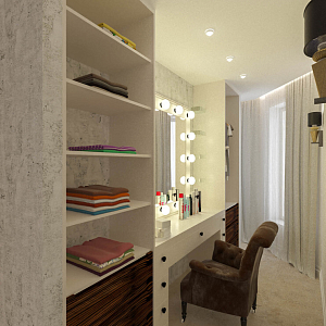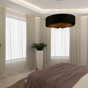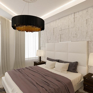 Интерьер спальни с бра над кроватью, подсветкой настенной, подсветкой светодиодной, рейками с подсветкой, с подсветкой, светильниками над кроватью и световыми линиями, проект «Спальные апартаменты Мысхако» №7
