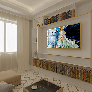 Интерьер гостиной с зеркалом в нише, зеркалом на двери, переговорной, проемом и проходной, проект «Комната для девочки подростка в Новороссийске» №4
