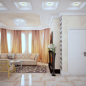 Интерьер гостиной с панно за телевизором, стеной с телевизором, телевизором на рейках, телевизором на стене и керамогранитом на стену с телевизором, проект «Геленджик кот. пос. Династия» №14