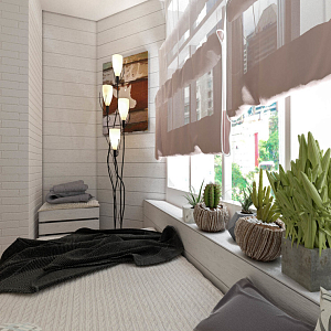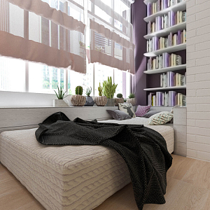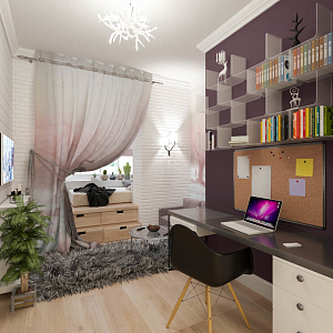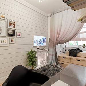 Интерьер гостиной с панно за телевизором, стеной с телевизором, телевизором на стене и керамогранитом на стену с телевизором в скандинавском стиле, проект «Комната для девочки подростка в скандинавском стиле» №4