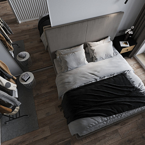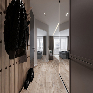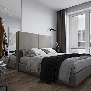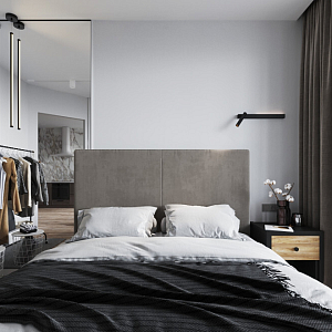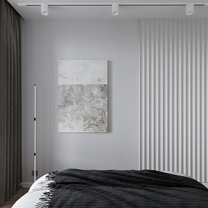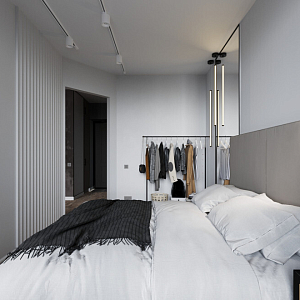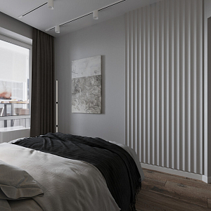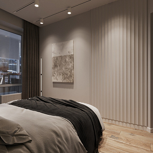Интерьер спальни cветовыми линиями, рейками с подсветкой, подсветкой настенной, подсветкой светодиодной и светильниками над кроватью в современном стиле, проект «Квартира для молодой девушки в стиле минимализм» №13