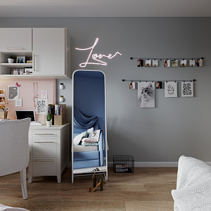 Интерьер балкона с балконом, световыми линиями, подсветкой настенной, подсветкой светодиодной, светильниками над кроватью и с подсветкой в современном стиле, проект «Колоритная квартира для семьи с двумя детьми (девочками)» №18