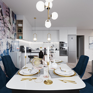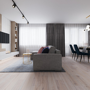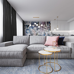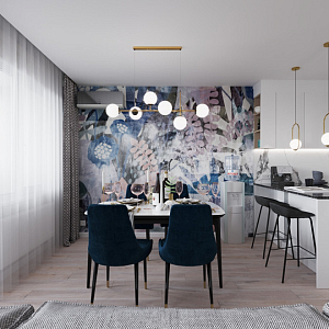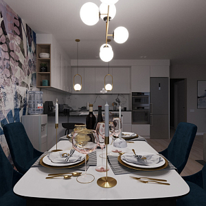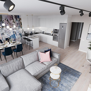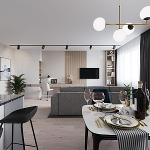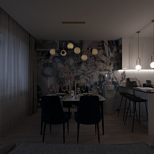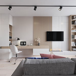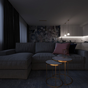 Интерьер гостиной cветовыми линиями, рейками с подсветкой, подсветкой настенной и подсветкой светодиодной в современном стиле, проект «Кухня-гостиная с акцентной фреской» №6