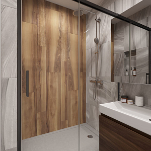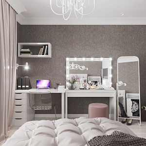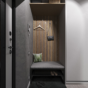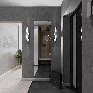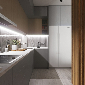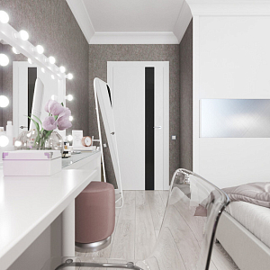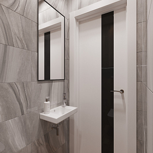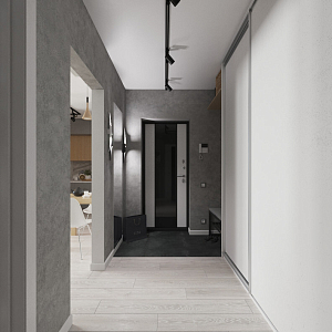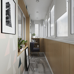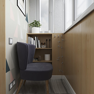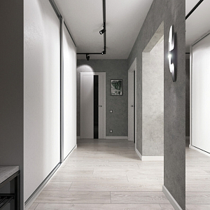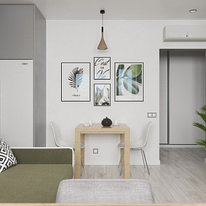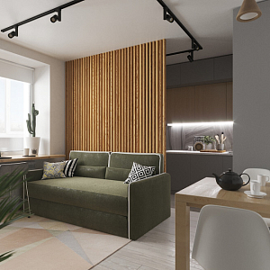 Интерьер гостиной с панно за телевизором, стеной с телевизором, телевизором на рейках, телевизором на стене и керамогранитом на стену с телевизором в современном стиле, проект «Светлый, воздушный интерьер в спокойных цветах» №2