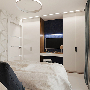 Интерьер гостиной с подсветкой светодиодной, светильниками над столом и световыми линиями в современном стиле, проект «Квартира в оттенках синего для семейной пары» №19