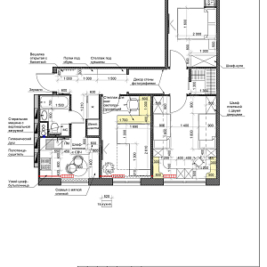 Интерьер с перегородкой, зонированием, без дверей, проходной, без окна, гостиной-столовой, кухней-нишей, проемом, с кабинетом, кухней-гостиной с коридором, open space, переговорной и порогом в современном стиле, проект «Квартира в панельном доме для семьи №25