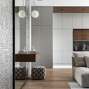 Интерьер гостиной с керамогранитом на стену с телевизором, панно за телевизором, подсветкой настенной, подсветкой светодиодной, с подсветкой и световыми линиями в стиле лофт, проект «Квартира 80кв.м Челябинск, Квартира» №25