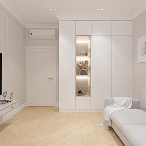 Интерьер с панно за телевизором, телевизором на стене и керамогранитом на стену с телевизором, проект «Льдинка на солнце ЖК Clever Park Екатеринбург 89,3 м2, Квартира» №41