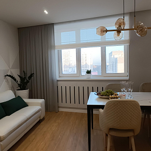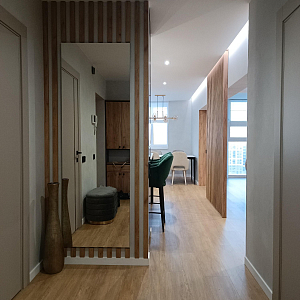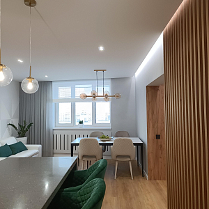 Интерьер столовой cветовыми линиями, рейками с подсветкой, светильниками над столом, подсветкой настенной, подсветкой светодиодной и с подсветкой, проект «Наталья Краснолесья Екатеринбург 71 м2, Квартира» №19