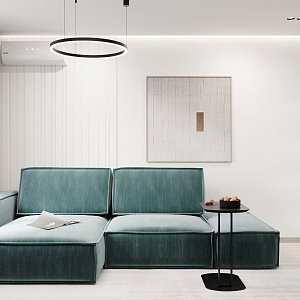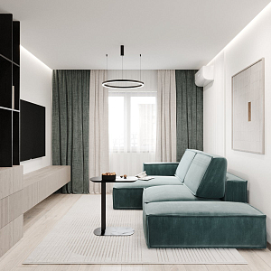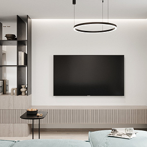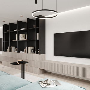 Интерьер гостиной с подсветкой настенной, подсветкой светодиодной, рейками с подсветкой, с подсветкой, светильниками над кроватью и световыми линиями, проект «Проект гостиной Нижний Новгород 12,3 кв.м., Комната» №6