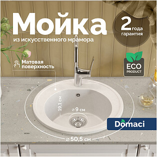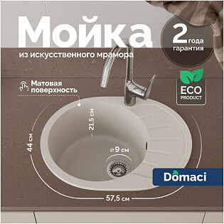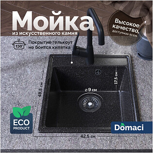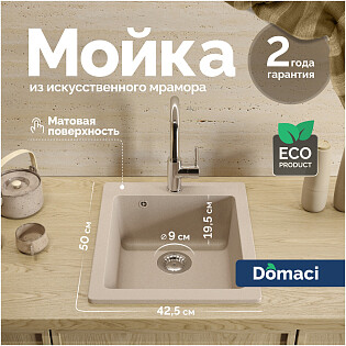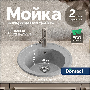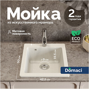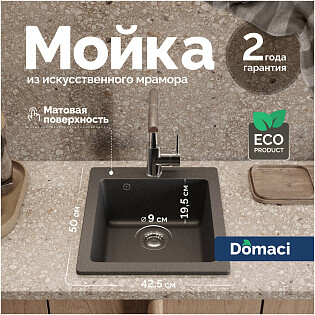 Компания Domaci выпускает не только классические прямоугольные или круглые кухонные мойки, но и асимметричные. Изделия представлены в классических и более смелых оттенках: оттенки серого, металлические цвета, консервативный белый, смелые черный и коричневый цвета.