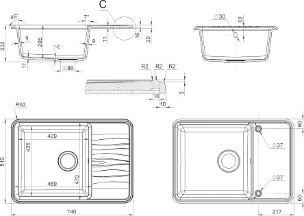 Мойка кухонная кварцевая прямоугольная 49х73 см антрацит Domaci "Римини" DG 74-49-501