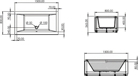 Ванна акриловая прямоугольная 70х150 см белая Creto Solly 18-15070