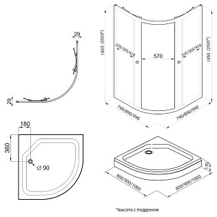 Душевой уголок четверть круга 90х90 см черный Diwo "Смоленск" SM01-090TB-G