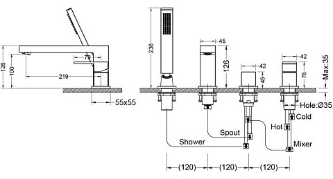 Душевой комплект встраиваемый с лейкой и изливом хром Wasserkraft A3151.268.270.271.087.103