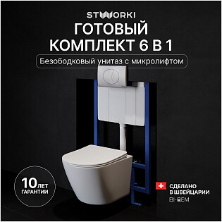Унитаз подвесной "Левангер" S07401WH с инсталляцией Stworki 510162 и кнопкой "Хельсинки" 500470