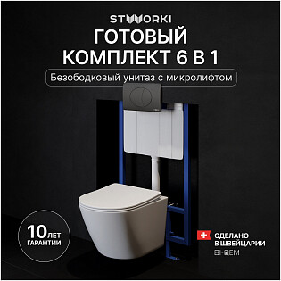 Унитаз подвесной "Левангер" S07401WH с инсталляцией Stworki 510162 и кнопкой 230858