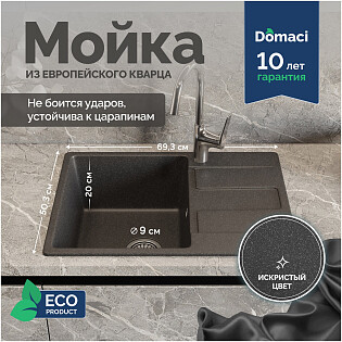 Мойка кухонная прямоугольная кварцевая с крылом черная Domaci "Солерно" DMQ-1700.Q