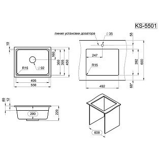 Кухонная мойка кварцевая прямоугольная шварц, черный металлик Granula KS-5501U шварц