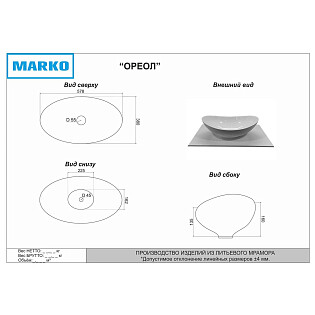 Раковина накладная из литьевого мрамора овальная 38х58 см белая Marko "Ореол-59" 5230590
