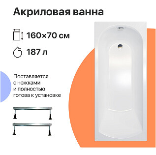 Ванна акриловая 160x70 см белая Diwo "Углич" Щ0000055174, Щ0000048583