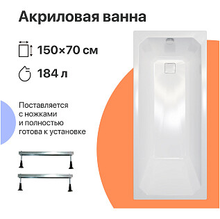 Ванна акриловая 150x70 см белая Diwo "Ярославль" 333191, 333194