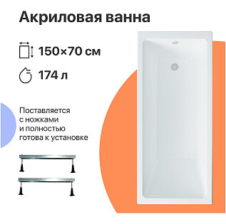 Ванна акриловая 150x70 см белая Diwo "Элиста" Щ0000055166, Щ0000048583
